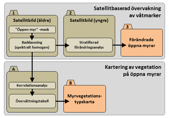 Figur 1. Schematisk presentation av arbetssättet för "Satellitbaserad övervakning av våtmarker", samt arbetssättet för att i "Kartering av vegetation på öppna myrar" ta fram en myrvegetationstypskarta.